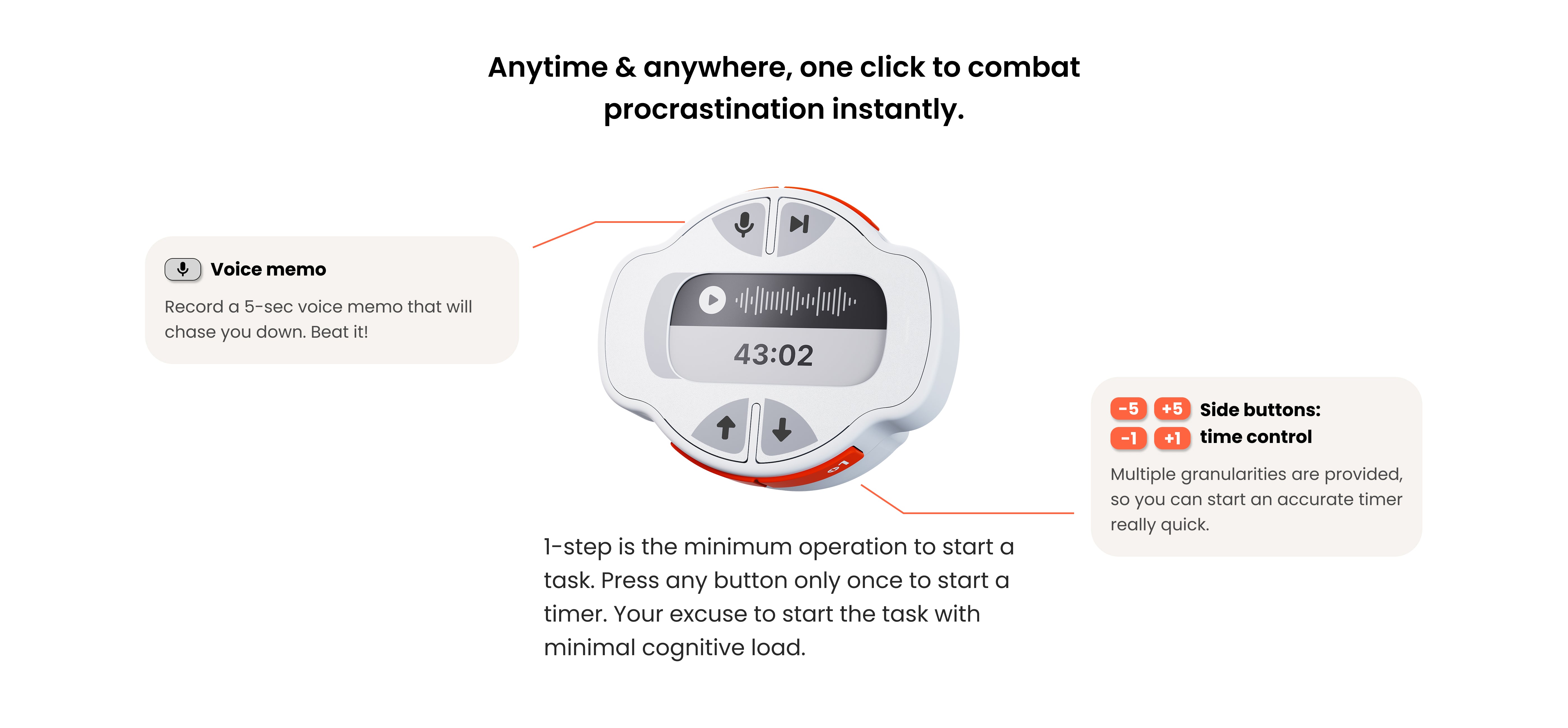 - E-ink screen shows your current task at a glance.
